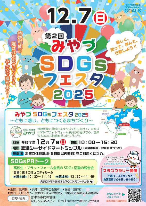 宮津市は、令和5年5月に国のSDGs未来都市として選定を受け、持続可能で選ばれるまちづくりを展開しています。こうした取組をみやづSDGsプラットフォーム会員※の取組を通じて発信し、会員相互の交流・連携も図りながらSDGsの市民理解の促進と行動変容につなげ、SDGsなまちづくりを加速化・充実させることを目的に本イベントを開催します。ぜひ、ご来場いただき、楽しく、知って、学んで、行動しましょう!